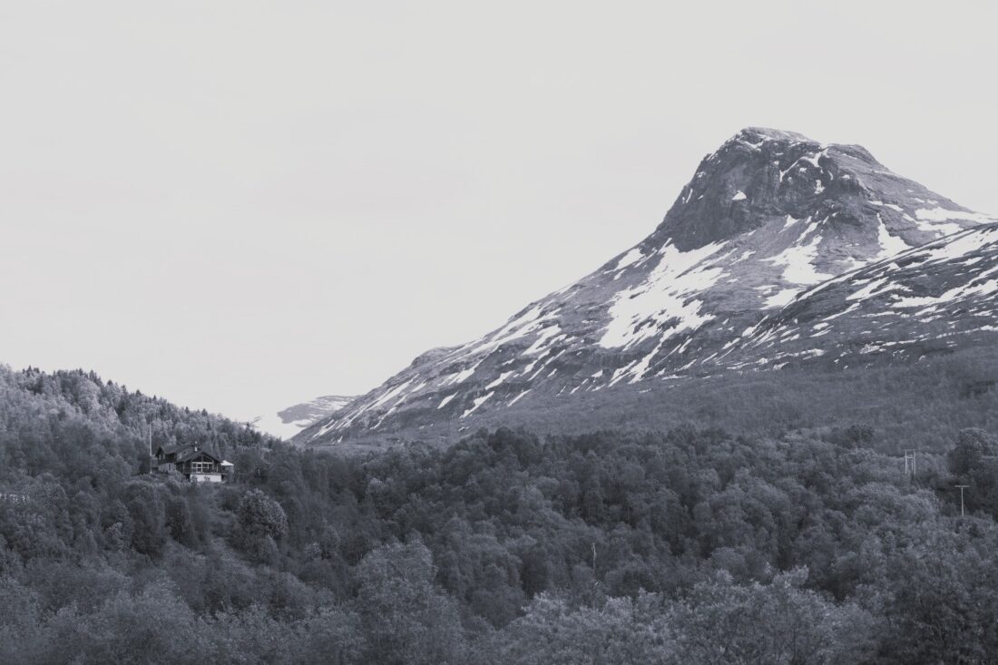 Description: V nekonečnej krajine za severným polárnym kruhom sa človek stáva len malým bodom v priestore. Hory stoja ticho a trpezlivo, zatiaľ čo ľudské obydlie sa v ich tieni takmer stráca. Táto fotografia z Nórska zachytáva kontrast medzi silou prírody a krehkosťou človeka – pripomína, že nie všetko musí byť veľké, aby to malo význam, a že niekedy je práve ticho tým najsilnejším momentom.