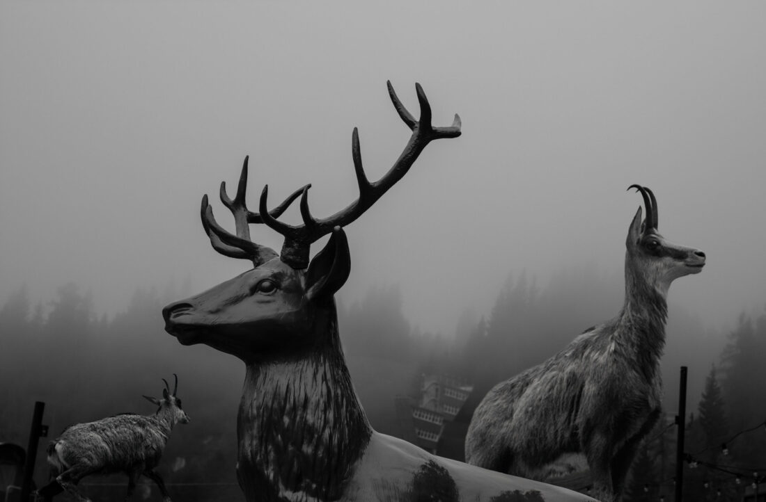 Description: "Spod Ostrej veže na Štrbské. Pod mostíkmi sme natrafili na jeleňa. Vôbec sa nehýbal a nemal žiaden pach." (Fotomontáž kamzíkov z fotografií do surreálnej fotografie s jeleňom)