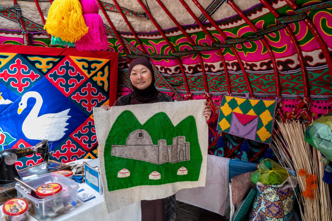 Description: Jurta z vlny a vŕby vlastnými rukami. Stroj po babičke. Karavanseraj Tash Rabat na Hodvábnej ceste. (Kirgizsko) Dlhší popis: Miestna pani vytvorila na dvore túto jurtu tradičnými postupmi od ostrihanej ovce a zoťatej vŕby. Na obraze stvárnila Tash Rabat na Hodvábnej ceste. Ak v jurte nespia turisti, pani v nej tvorí na stroji po babičke. Babičkina babička by sa veľmi čudovala, koľko sýtych farieb môže byť dnes v jurte. Po stáročia to bola hlavne prírodná farba vlny, zemitá červená z miestnej rastliny a indigo z Hodvábnej cesty. (Naryn, Kirgizsko)