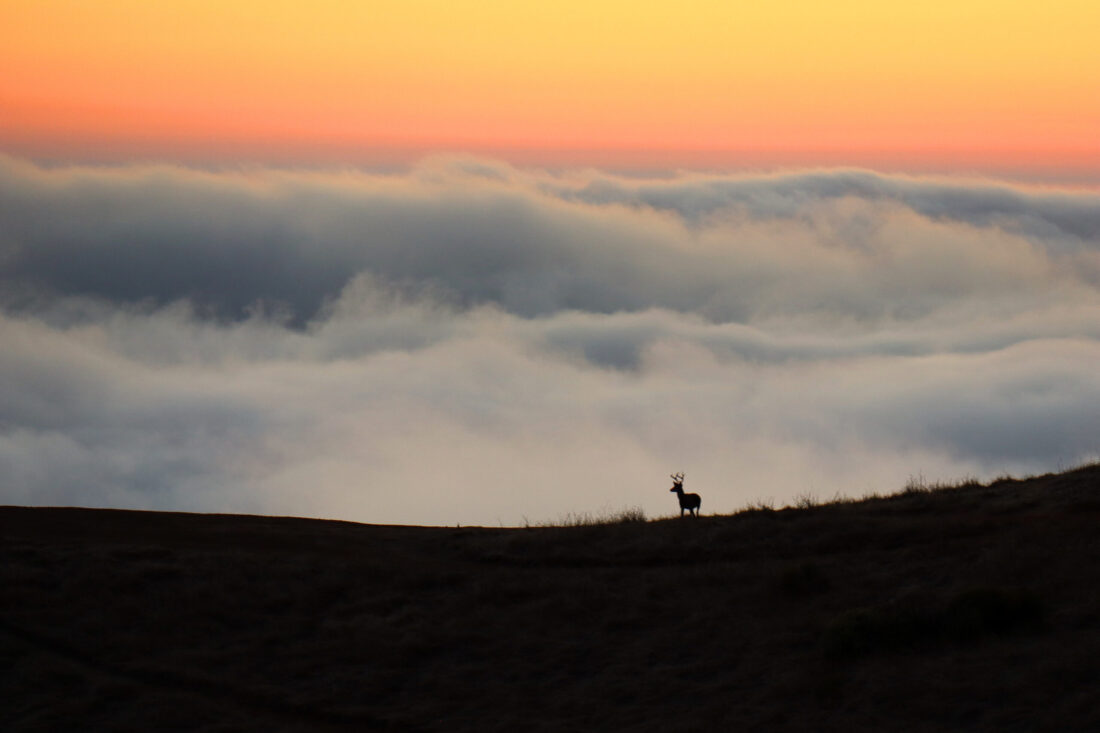 Description: Silueta jeleňa pri západe slnka nad oblakmi a hmlou