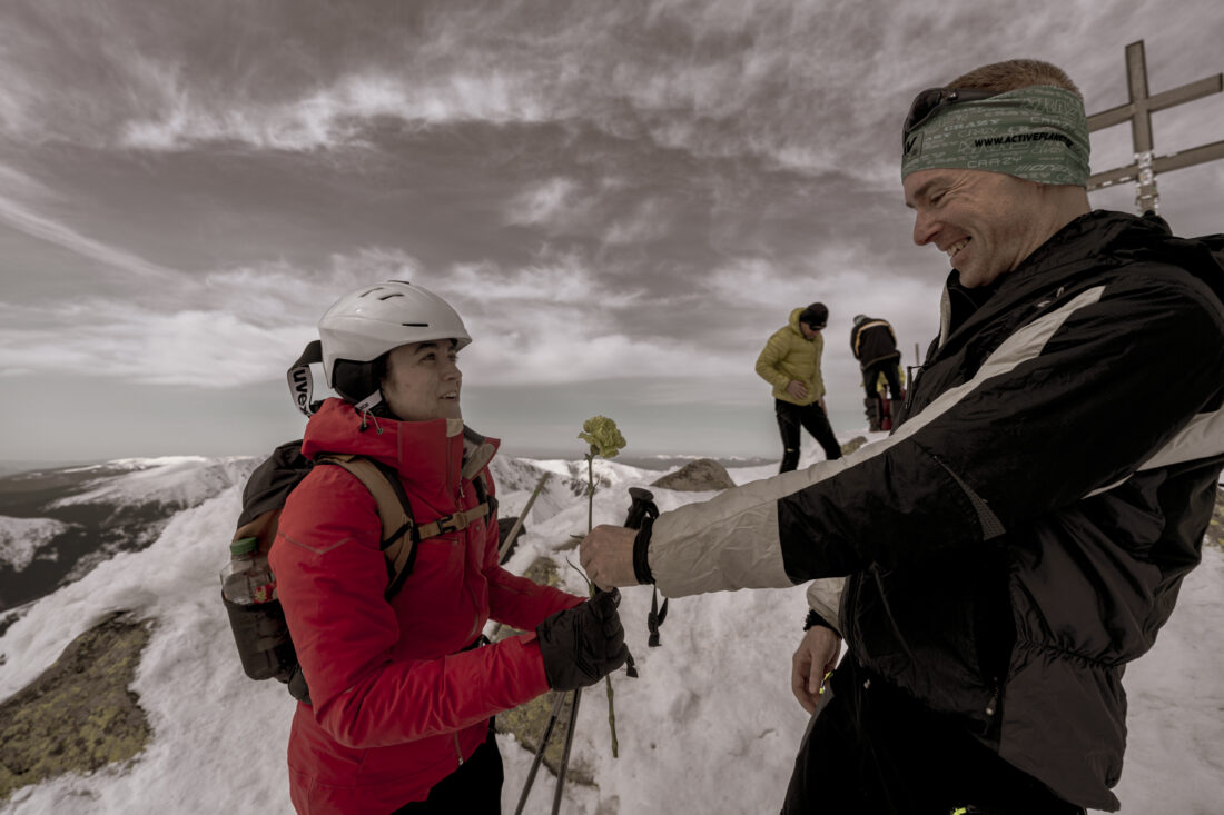 Description: Skialpinisti vyniesli na Ďumbier veľkú kyticu karafiátov a rozdávali ich všetkým ženám, aby aj ženy na Ďumbieri oslávili MDŽ.