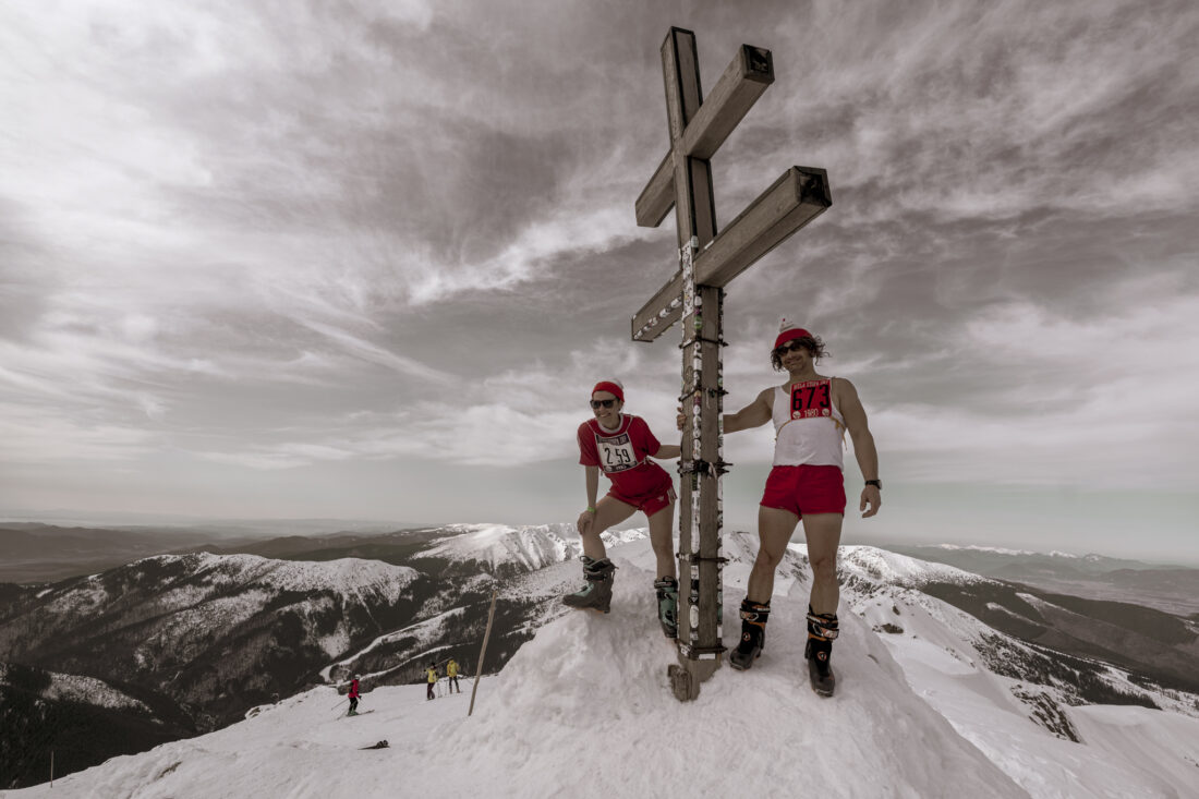 Description: Asi 50 účastníkov skialpového (turistického) podujatia sa zúčastnila retro výstupu na Ďumbier. Niekto sa obliekol štýlovo a niekto vytiahol staré lyže a vystúpil na vrchol Ďumbiera.
