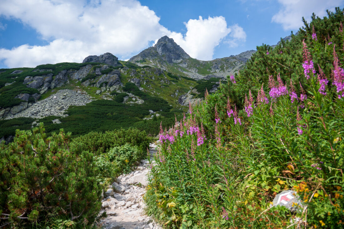 Description: Vysoké Tatry vo svojej plnej letnej kráse môžu mať veľa podôb podľa toho, čo človek hľadá. Táto fotografia zachytáva červenú turistickú značku smerom na Rysy fotená v auguste 2025, scénu, ktorú po ceste zhliadlo mnoho turistov. Rozkvitnuté vysokohorské lúky vytvárajú niečo, čo si človek musí prísť pozrieť naživo.